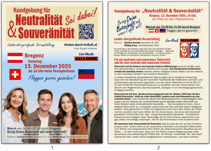 dass sich die Bevölkerung der neutralen Nachbarländer Österreich, Schweiz und Liechtenstein gemeinsam organisiert, um der klaren Mehrheit (in AT bei 80 %!, siehe Artikel in Die Presse; obgleich tendenziös geschrieben) für den Erhalt der Neutralität Ausdruck zu verleihen und den erkennbaren Tendenzen der Regierenden (Sanktionspolitik, Drängen in ein Verteidigungsbündnis) entgegenzutreten.