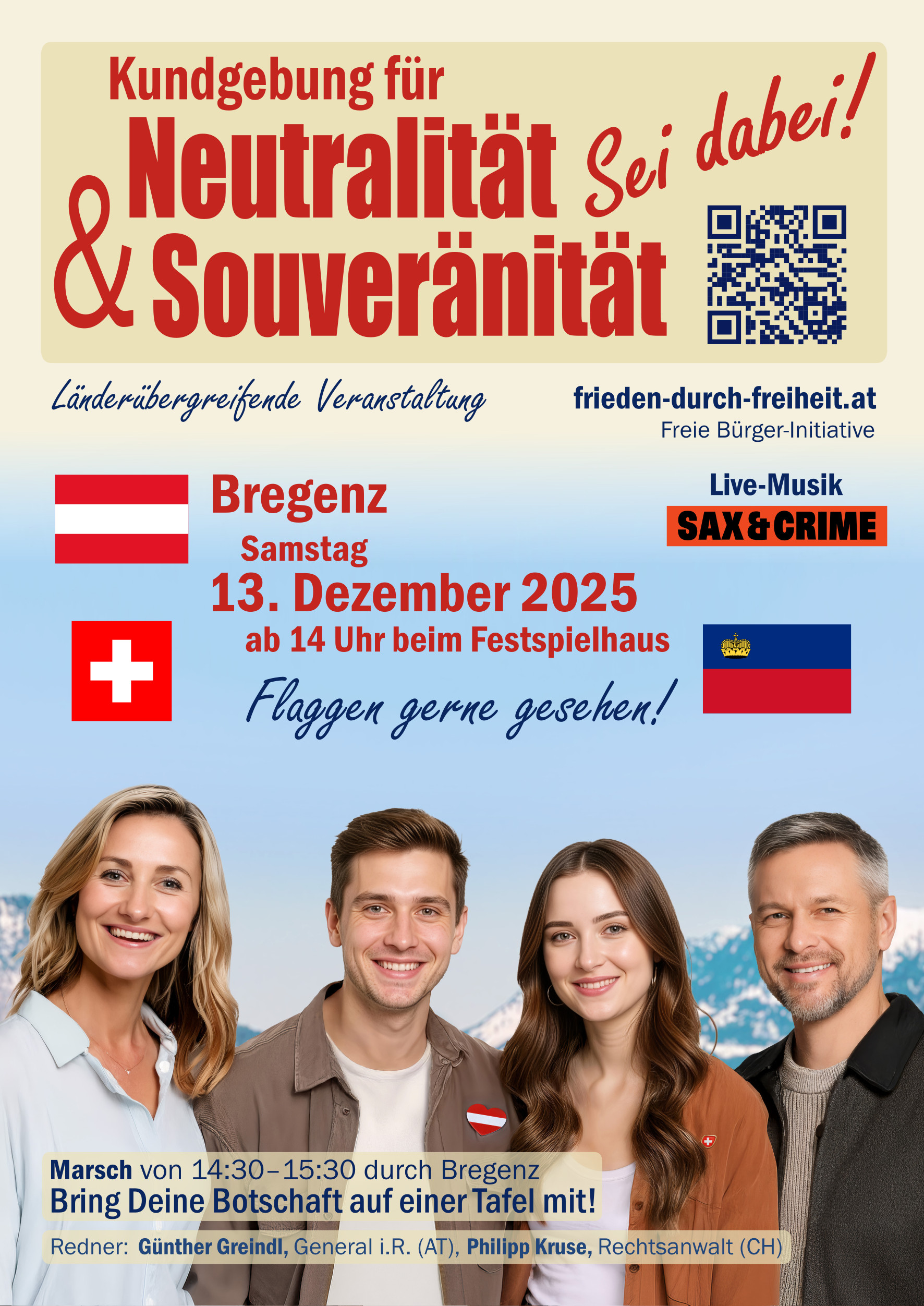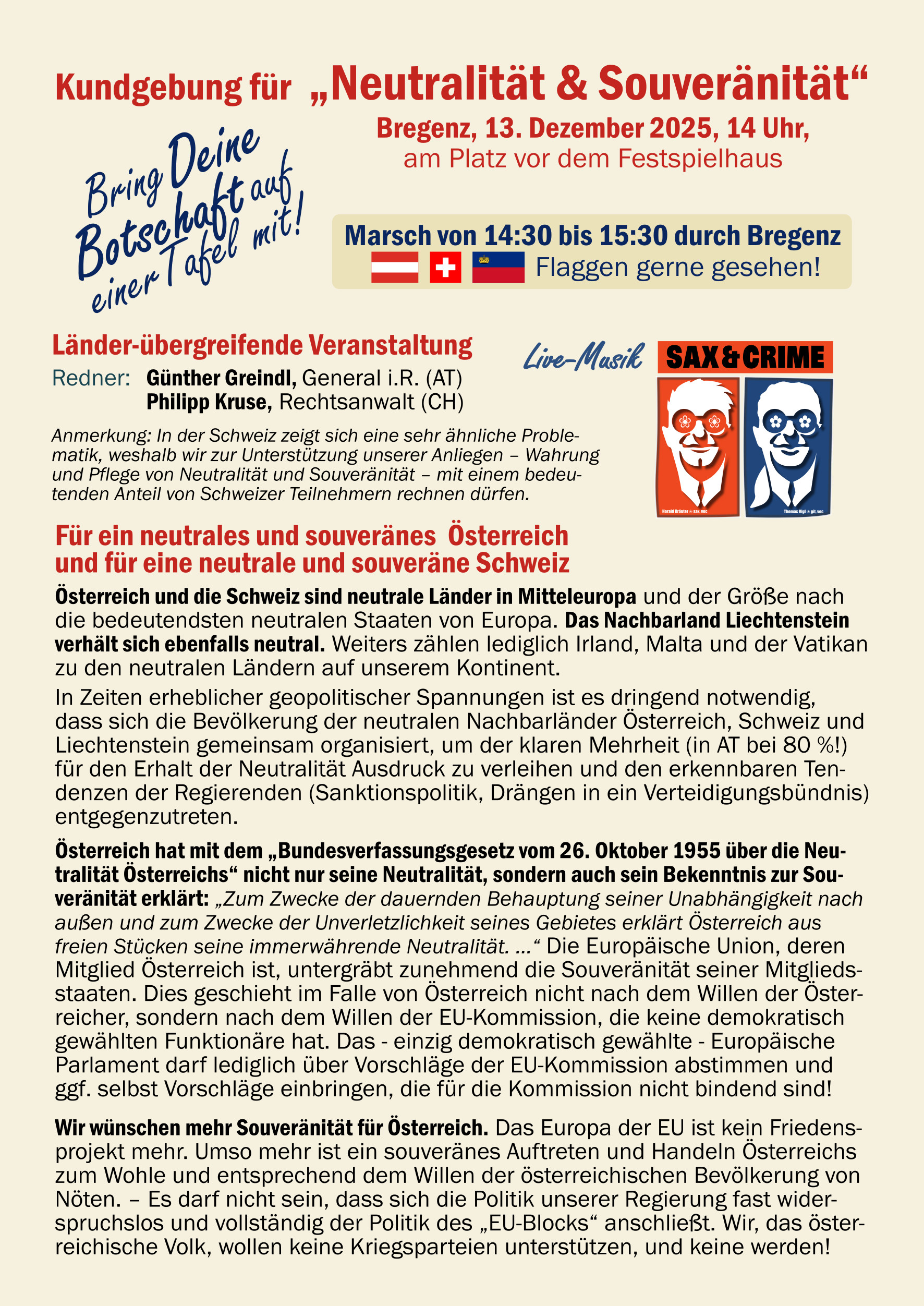 13. Dezember: 14 Uhr Kundgebung für „Neutralität & Souveränität“