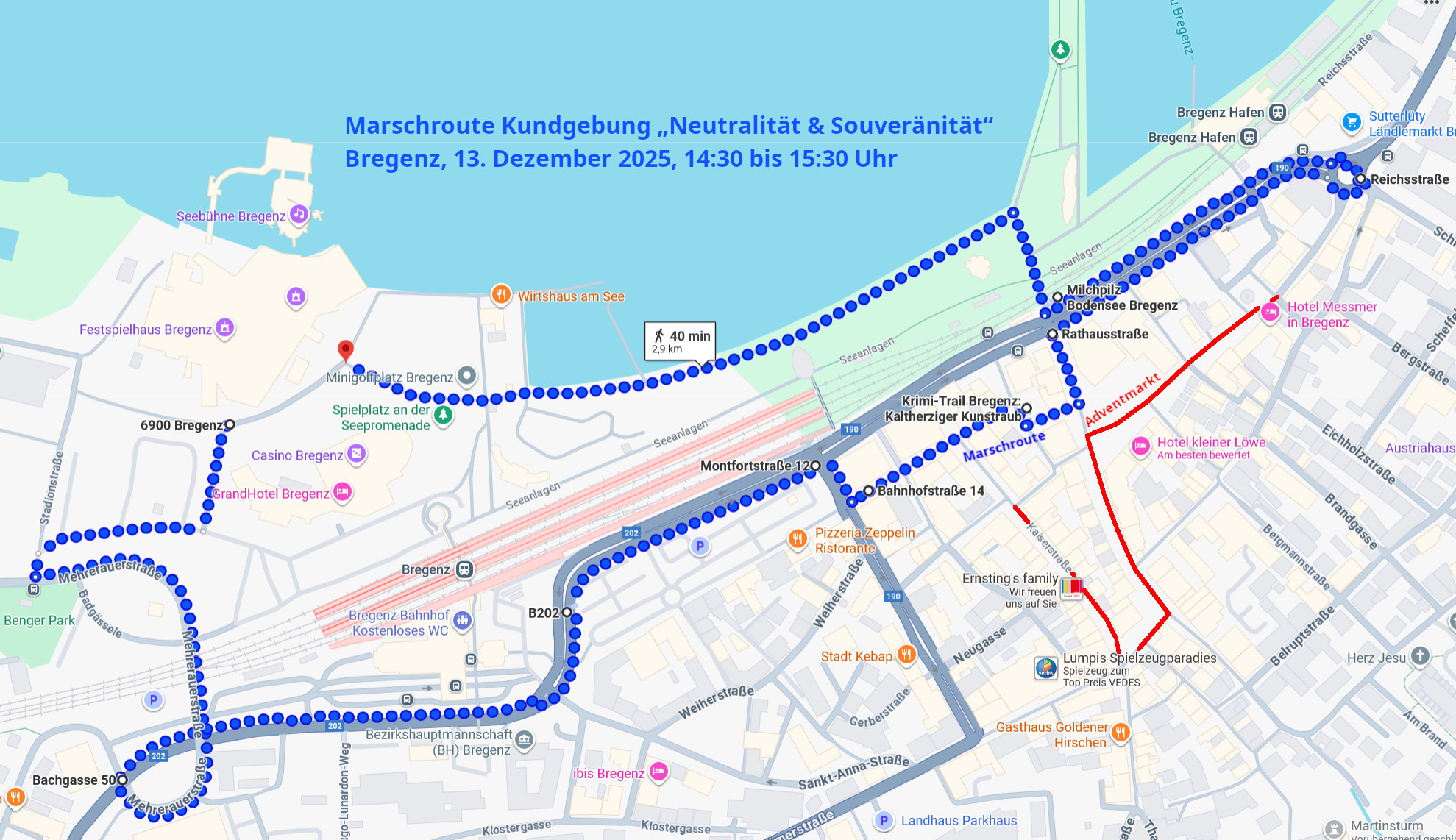 Sei dabei! — Die Teilnahme an unserer gemeinsamen Kundgebung für „Neutralität & Souveränität“ ist über den Bahnhof Bregenz bestens erreichbar! (siehe Landkarte; GPS: 47.504600413376274, 9.738542836585916)