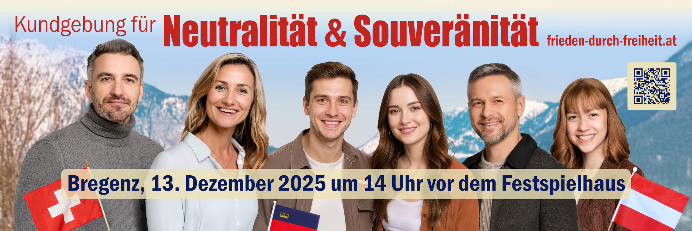 dass sich die Bevölkerung der neutralen Nachbarländer Österreich, Schweiz und Liechtenstein gemeinsam organisiert, um der klaren Mehrheit (in AT bei 80 %!, siehe Artikel in Die Presse; obgleich tendenziös geschrieben) für den Erhalt der Neutralität Ausdruck zu verleihen und den erkennbaren Tendenzen der Regierenden (Sanktionspolitik, Drängen in ein Verteidigungsbündnis) entgegenzutreten.