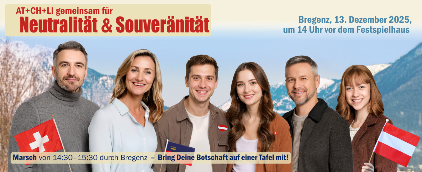 Anmerkung: In der Schweiz zeigt sich eine sehr ähnliche Problematik, weshalb wir zur Unterstützung unserer Anliegen – Wahrung und Pflege von Neutralität und Souveränität – mit einem bedeutenden Anteil von Schweizer Teilnehmern rechnen dürfen.